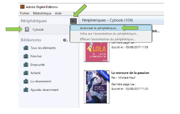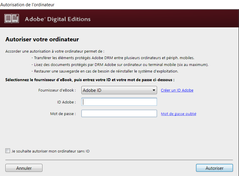 Tout comme vous devez autoriser votre ordinateur lorsque vous installez Adobe Digital Editions (voir l'aide sur le sujet), il vous faut également autoriser la liseuse dans Adobe Digital Editions, car elle est considérée comme un appareil à part entière.