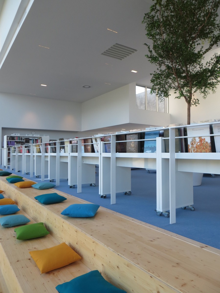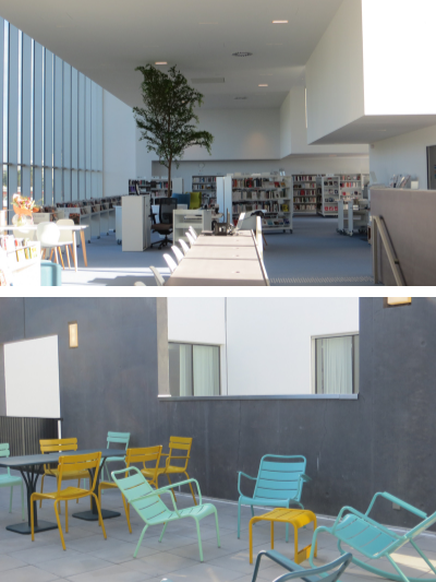 L'étage accueille quant à lui les espaces enfants, ados et adultes, ainsi qu'une belle terrasse et un grand gradin descendant avec vue sur les arbres et le boulevard, pour lire, se poser, rêver...